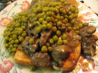 | Return the chicken livers and onions to the boiling mixture and lower heat and simmer for ten minutes. | Toast four pieces of bread and use two per person and spread chicken livers/gravy/onions evenly over the toast. |